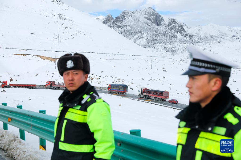 10月22日,折多山交通管理警务站副站长包永鹏(左)和辅警白玛木洛在海拔4200多米的折多山垭口执勤。