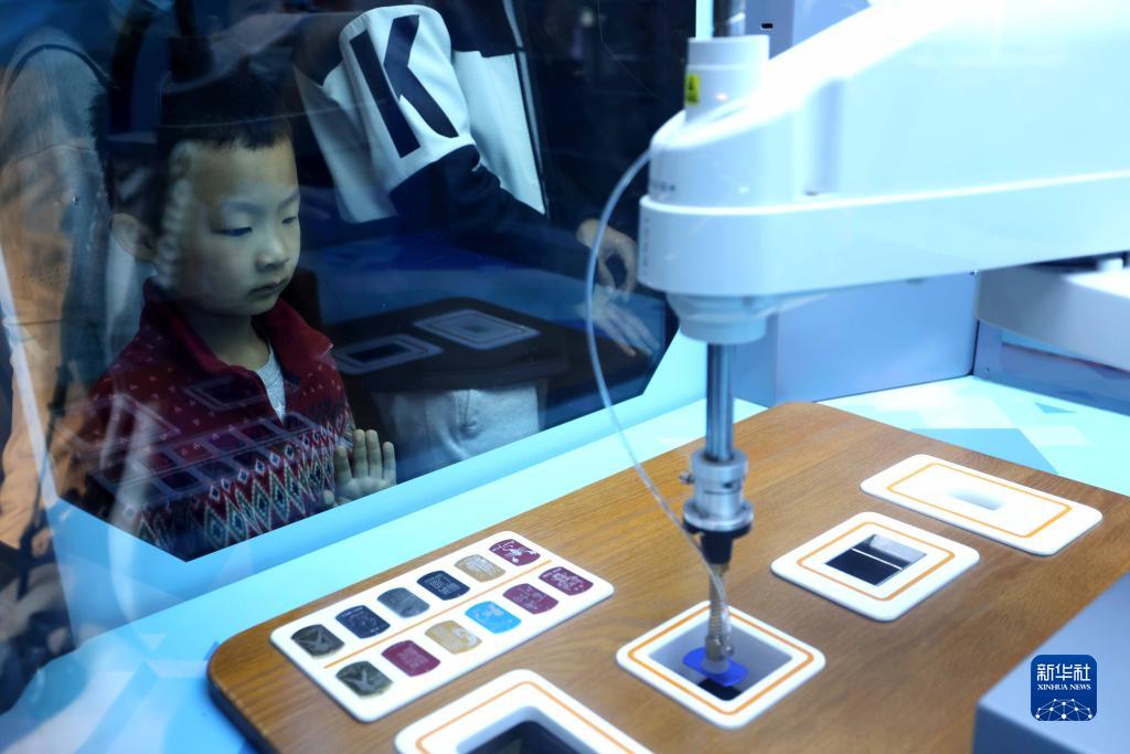 10月23日,在第十五届合肥国际文化博览会现场,小朋友在观看雕刻机器人作业。