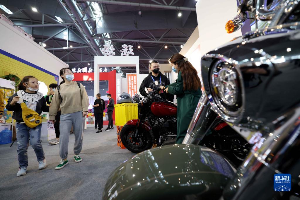 10月23日,在第十五届合肥国际文化博览会合肥市瑶海区展馆,市民在参观体验摩托车。