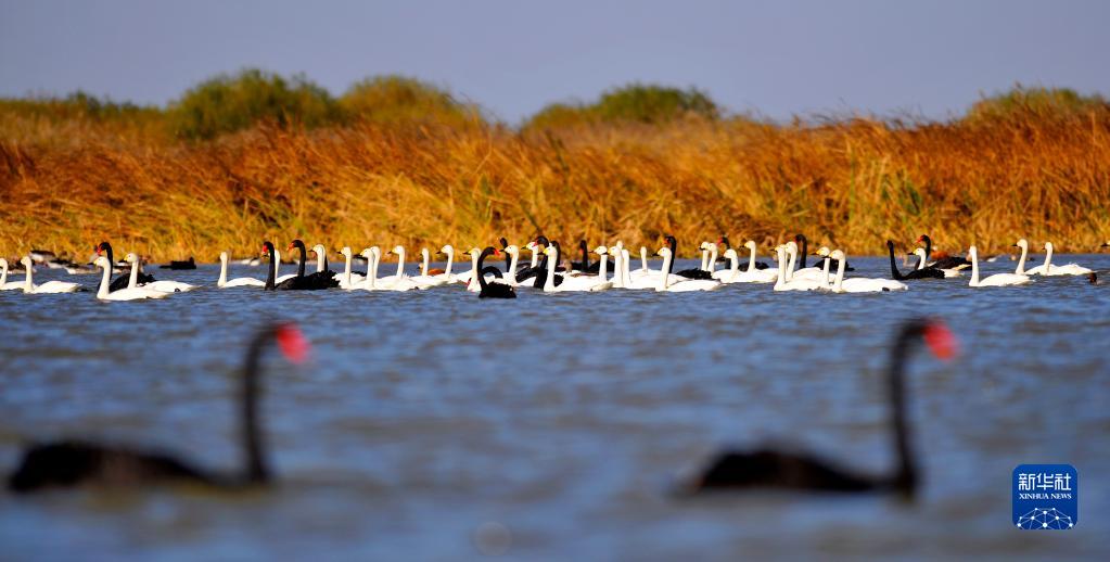 在山东黄河三角洲国家级自然保护区,天鹅在水中游弋(2012年10月31日摄)。