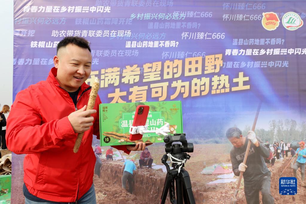 当日,主题为“青力支农 联助振兴”的河南省青年联合会助力乡村振兴直播带货活动在温县武德镇苏王村举行。当地邀请来自全国各地怀药经销商、新媒体主播等60余人在采挖现场共同推介、销售温县铁棍山药,助农惠农。