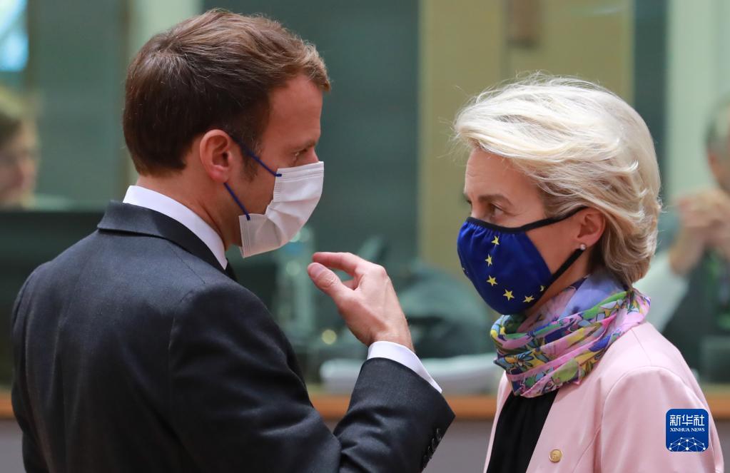 10月21日,在位于比利时布鲁塞尔的欧盟总部,法国总统马克龙(左)与欧盟委员会主席冯德莱恩交谈。