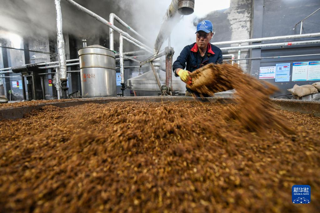 深秋时节,河北省丰宁满族自治县的白酒企业进入酿酒繁忙期,当地企业员工按照非遗酿造技艺生产白酒,浓郁的酒香在厂区飘荡。