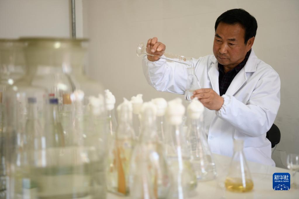10月23日,在丰宁县一家酿酒企业,技术人员在进行小样酒调配。