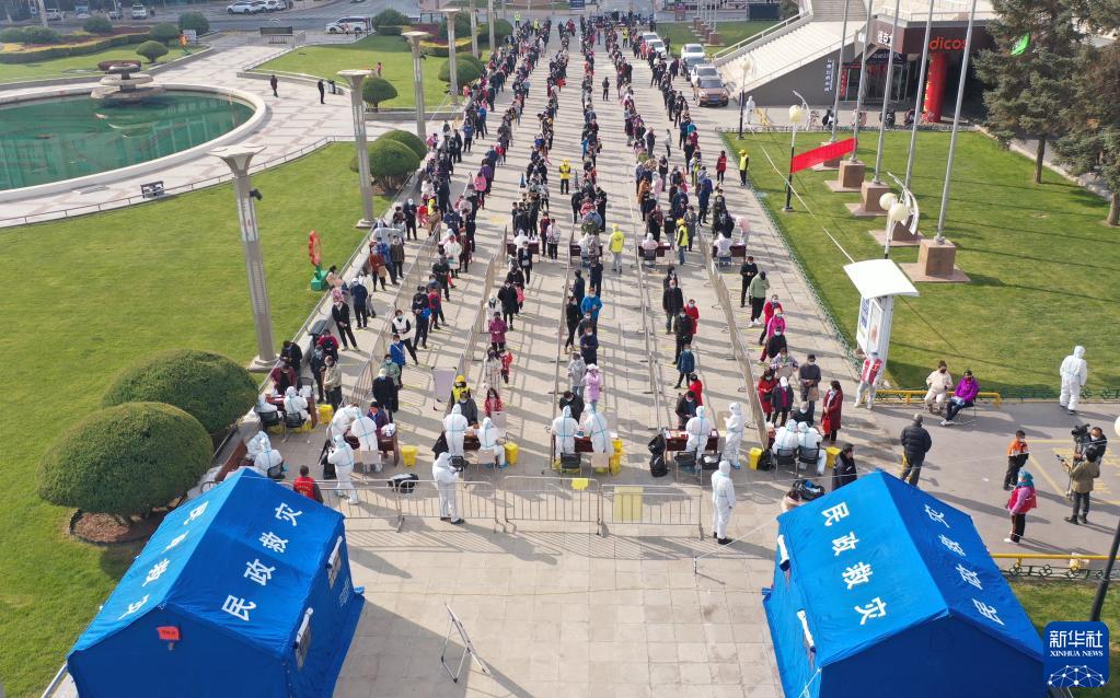 10月23日,在宁夏银川市兴庆区光明广场,居民排队进行核酸检测(无人机照片)。