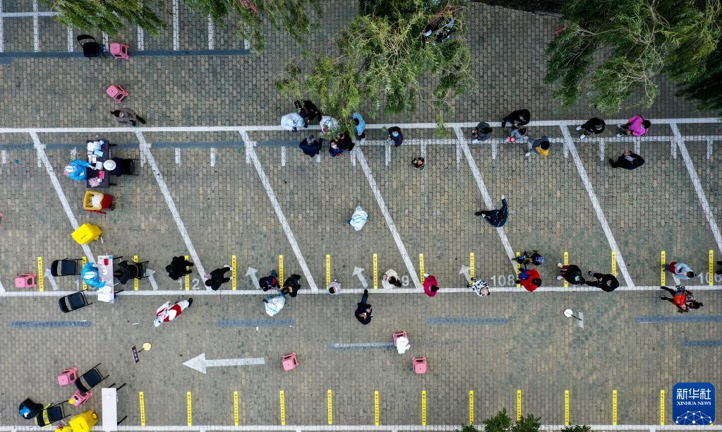 10月23日,在宁夏银川市金凤区森林公园采样点,居民排队进行核酸检测(无人机照片)。