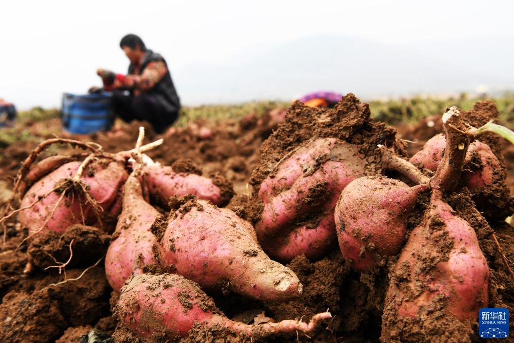 10月23日,山东省枣庄市山亭区芹沃村农民在田间收获地瓜。