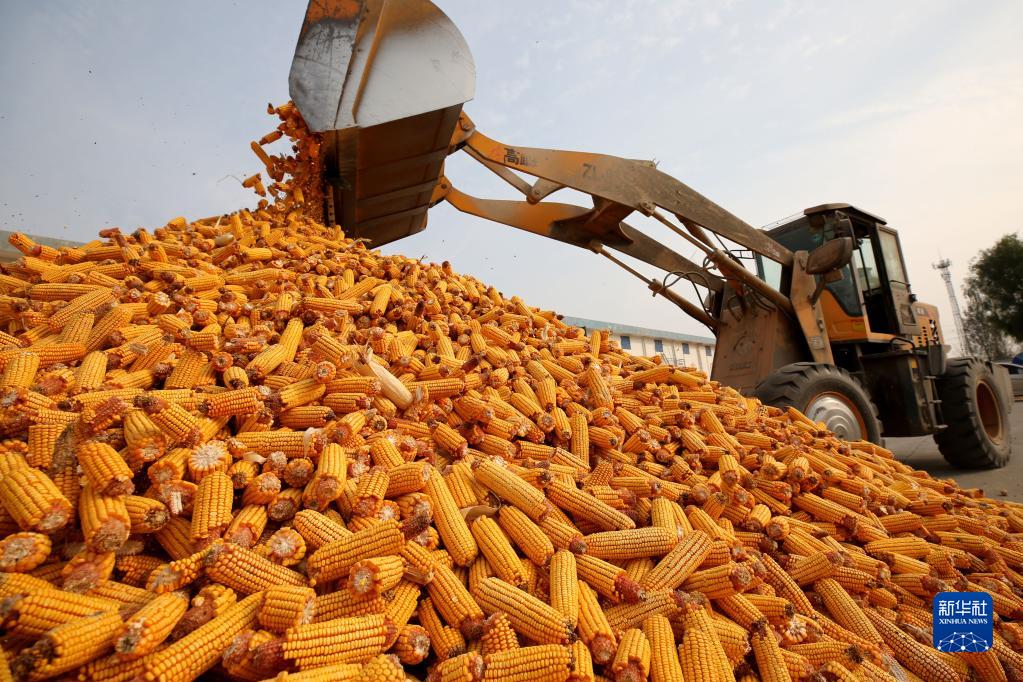 10月23日,山东省枣庄市峄城区古邵镇文堆村土地股份合作社的社员在晾晒玉米。