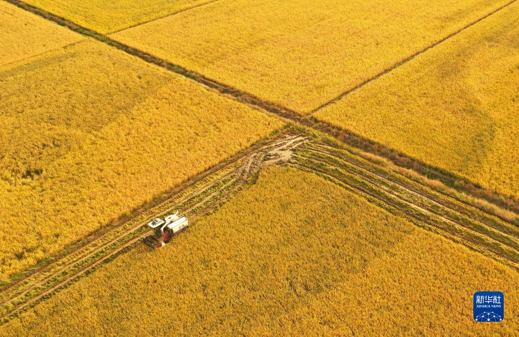 10月23日,湖南省衡阳市衡阳县西渡镇青里村,当地村民驾驶收割机在收割晚稻(无人机照片)。