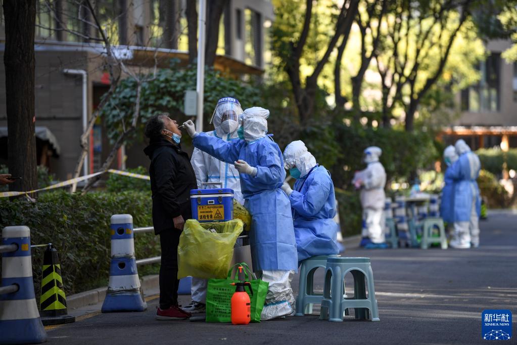 10月21日,医务人员在宁夏银川市金凤区森林半岛小区为居民进行核酸采样。