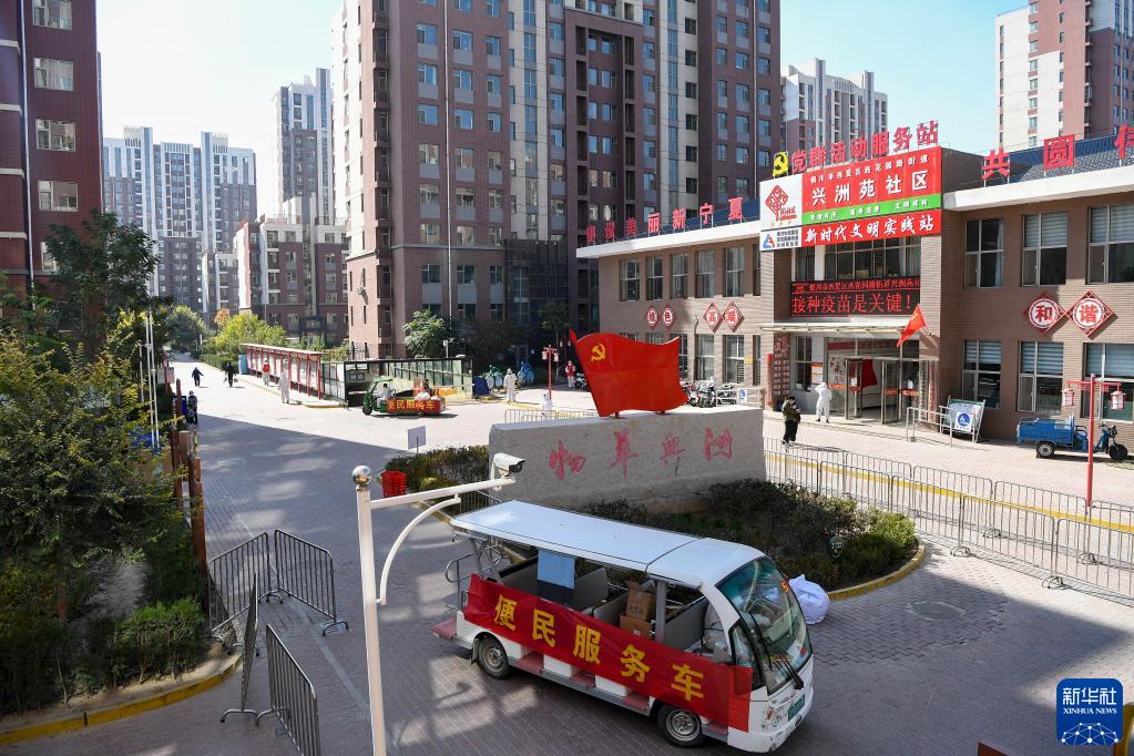 在宁夏银川市西夏区物华兴洲苑社区,工作人员驾驶便民服务车为居民运送生活物资(10月21日摄)。