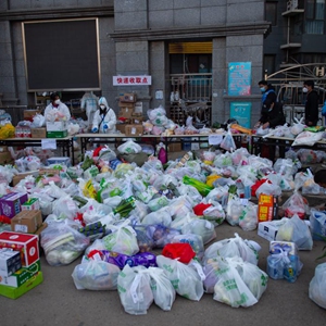当日,北京市昌平区北七家镇宏福苑社区由中风险地区调整为高风险地区,该区域已按照疫情防控要求,进行封控管理。为保障居民生活,社区入口处设立了快递收取点,配送员将货物放置于此,由疫情防控人员送货到家。新华社记者 陈钟昊 摄