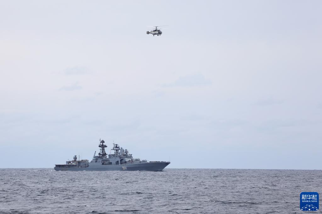 当地时间10月19日,中俄首次海上联合巡航舰艇编队在西太平洋海域联合机动。这是俄方舰载直升机从俄方“特里布茨海军上将”号大型反潜舰附近飞过。