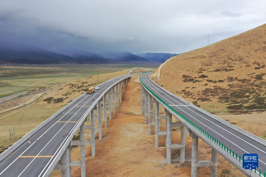 西藏拉萨市当雄县境内由中铁城投承建的京藏高速那曲至羊八井段堆巴果大桥(5月29日摄,无人机照片)。