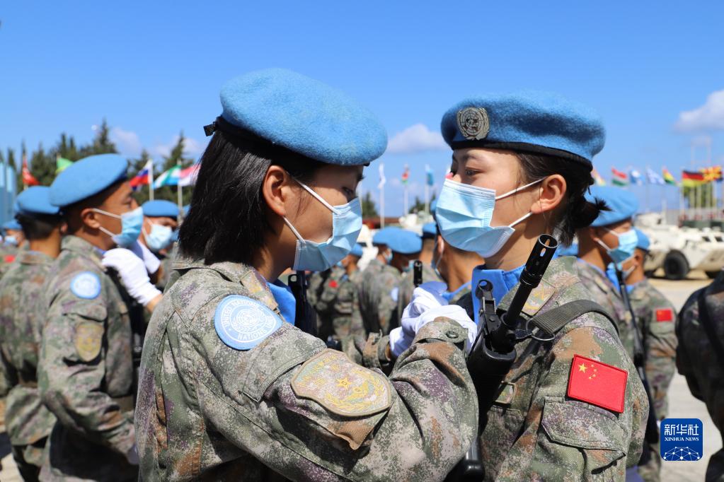 2021年6月16日,在黎巴嫩南部辛尼亚村中国维和营举行的授勋仪式上,接受检阅的维和女兵进场前互相整理着装。中国第19批赴黎巴嫩维和部队授勋仪式16日上午在黎巴嫩南部辛尼亚村的中国维和营举行,410名官兵全部被授予联合国和平勋章。