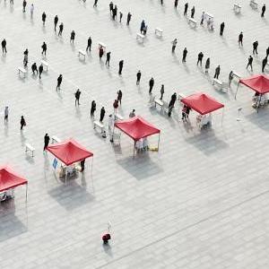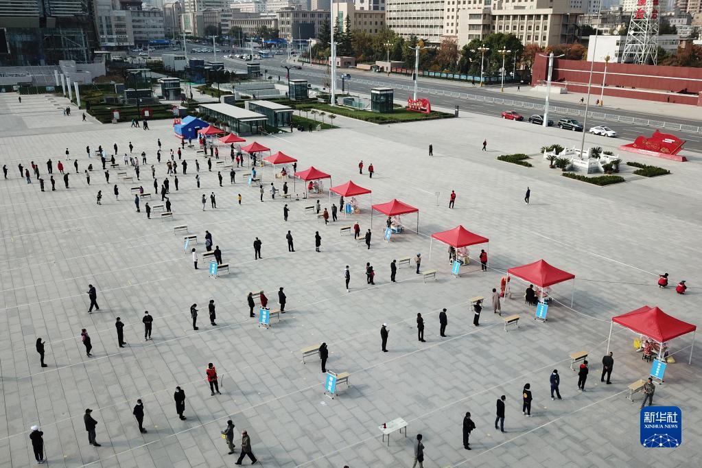 10月24日,在兰州市城关区东方红广场核酸检测采样点,参检市民排队接受核酸采样(无人机照片)。