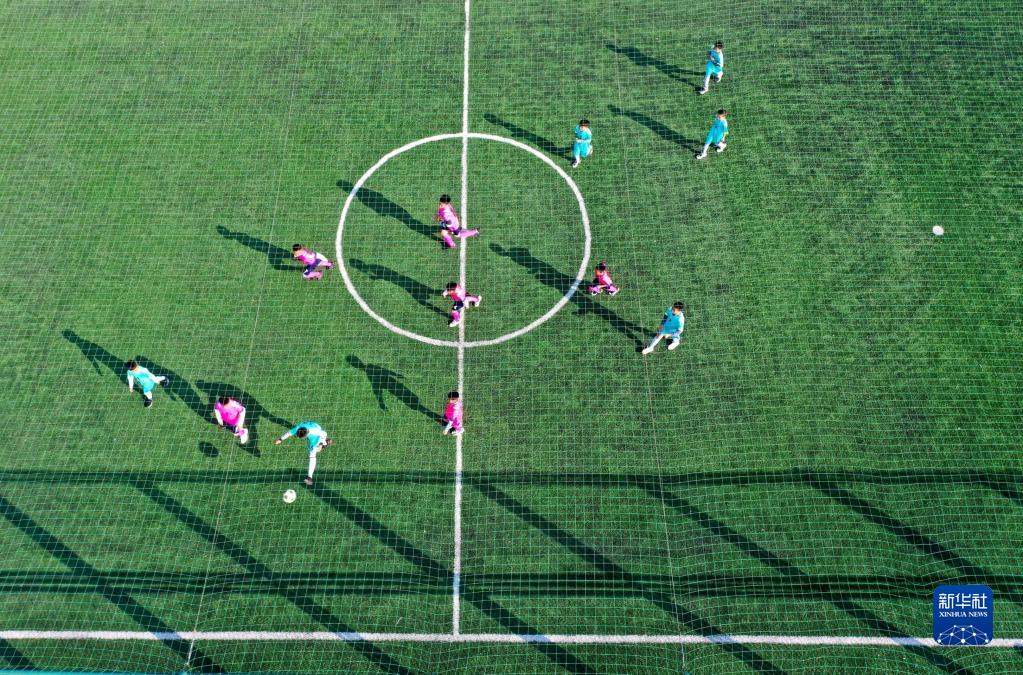 10月24日,山东省青岛市即墨区龙山街道团彪庄村的小学生在足球场踢球(无人机照片)。