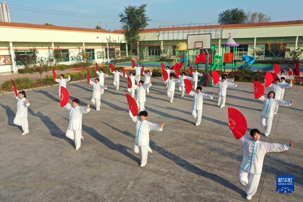 10月24日,山东省青岛市即墨区龙山街道西程哥庄村村民在练习太极扇(无人机照片)。
