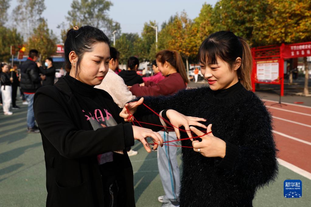 10月24日,居民在河南省宝丰县杨庄镇马山根村文化广场参加翻花绳比赛。