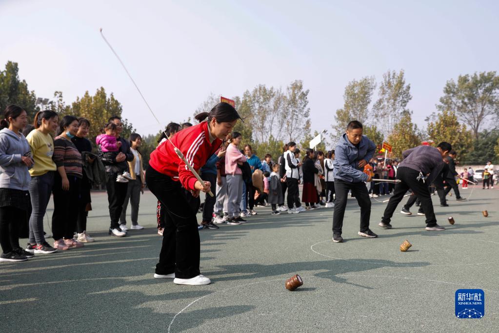 当日,一场以传统体育、游艺项目为主的趣味运动会在河南省宝丰县杨庄镇马山根村举行,当地居民参加了踢毽子、推铁环、跳皮筋、打陀螺、老鹰捉小鸡等项目的比赛,在趣味传统项目中放松身心,收获快乐。