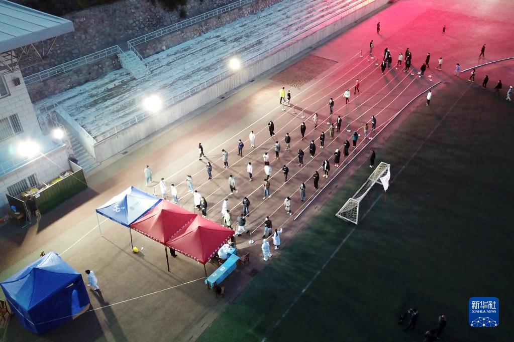 10月24日,在位于兰州市城关区的西北民族大学,学生在操场上排队进行核酸检测采样(无人机照片)。