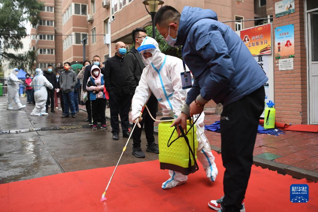 在因疫情封控的甘肃省兰州市城关区云祥小区,工作人员在对小区进行消杀(10月19日摄)。