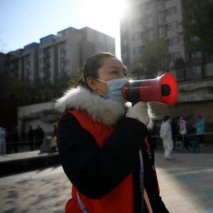 10月23日,宁夏银川市兴庆区海宝西区,志愿者提醒排队进行核酸检测的居民保持距离。