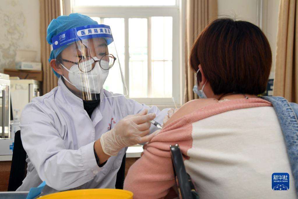 10月25日,在北京市平谷区滨河街道新冠疫苗接种点,医护人员为接种人员接种新冠疫苗加强针。