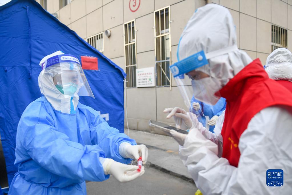 10月25日,在呼和浩特市赛罕区昭乌达南路街道惠民社区核酸检测点,志愿者扫码获取采样试管信息。