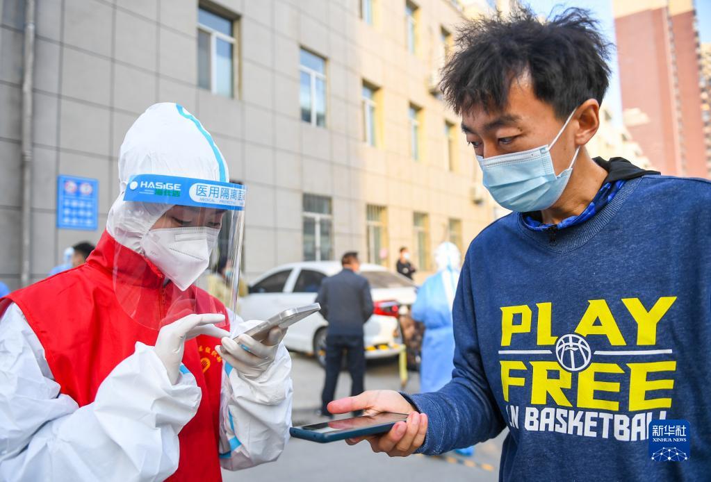 10月25日,在呼和浩特市赛罕区昭乌达南路街道惠民社区核酸检测点,志愿者为居民扫码登记信息。