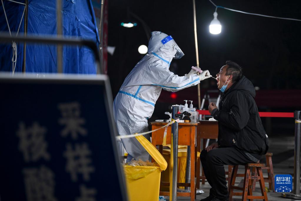 10月24日凌晨,在宁夏银川市兴庆区玉皇阁广场采样点,医务人员对居民进行核酸采样。