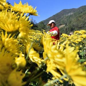 10月25日,村民在湖北省襄阳市保康县黄堡镇大屋场村金丝皇菊种植基地采摘金丝皇菊。