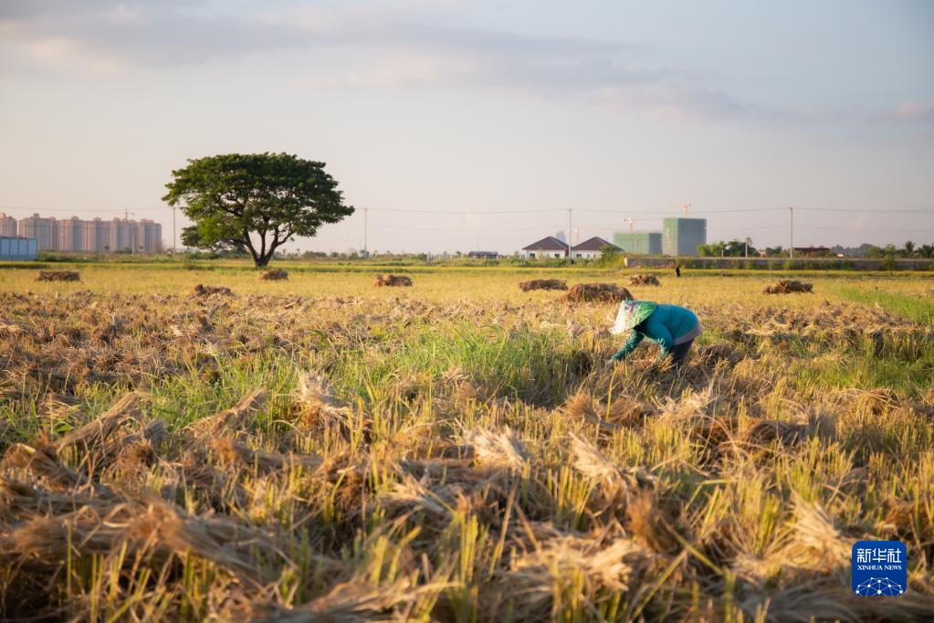 10月25日,农民在老挝万象城边的田地里收割稻谷。