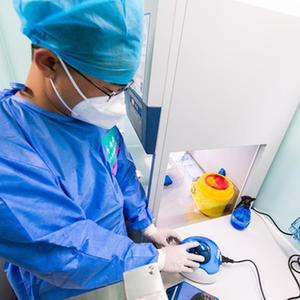10月25日,在P2+移动生物检测车上,中南大学湘雅二医院医生蒋传好准备把配置好的检测试剂从试剂准备间传递到样本制备间。