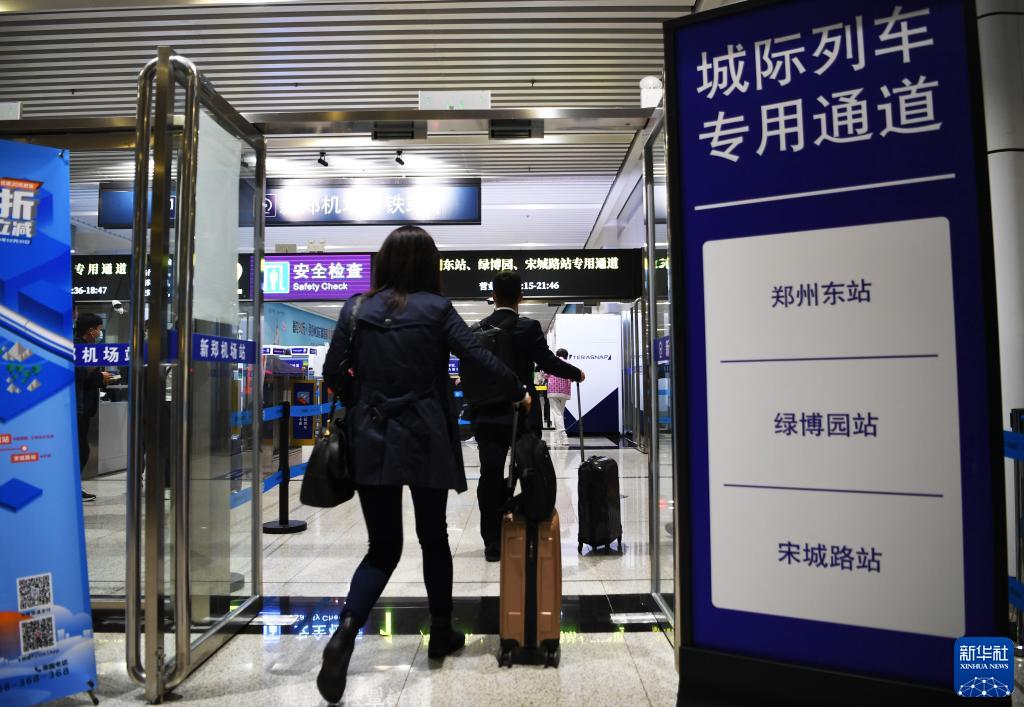 10月26日,旅客在郑机线新郑机场站走入城际列车专用通道。