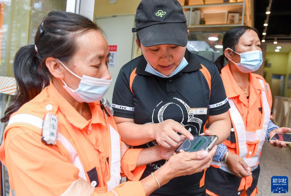 10月26日,在深圳福田区家乐缘餐厅海松店,店内工作人员帮助环卫工人通过小程序领取餐券。