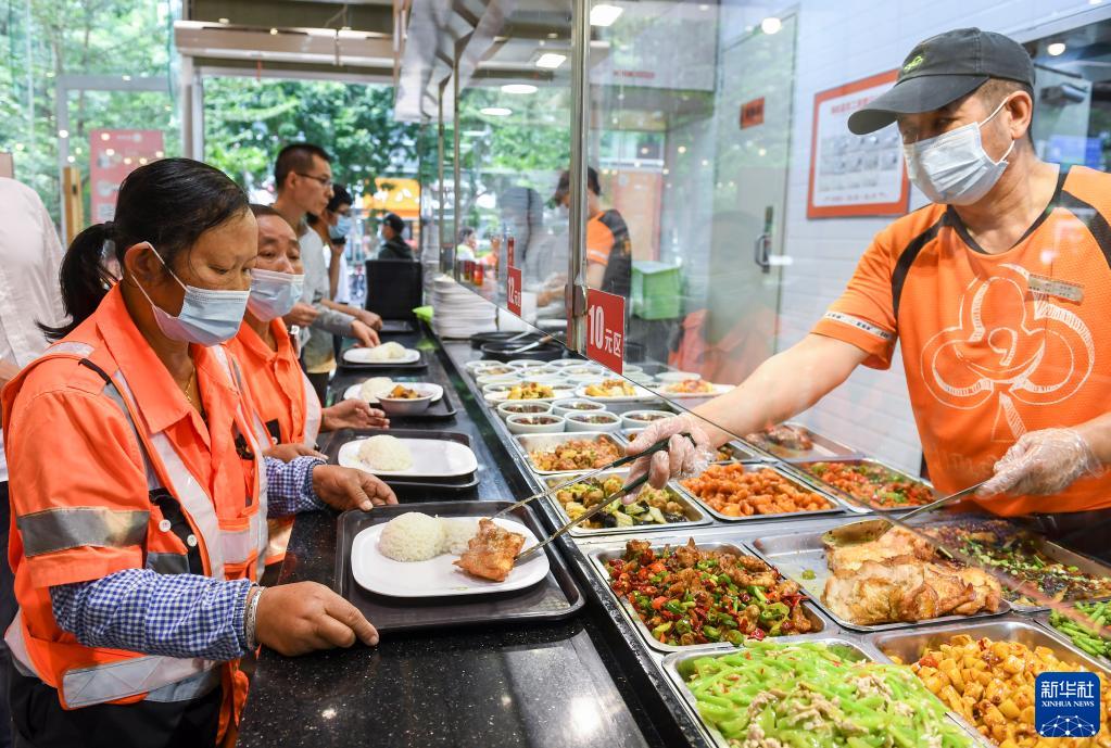 10月26日,在深圳福田区家乐缘餐厅海松店,环卫工人选取“爱心餐”菜肴。