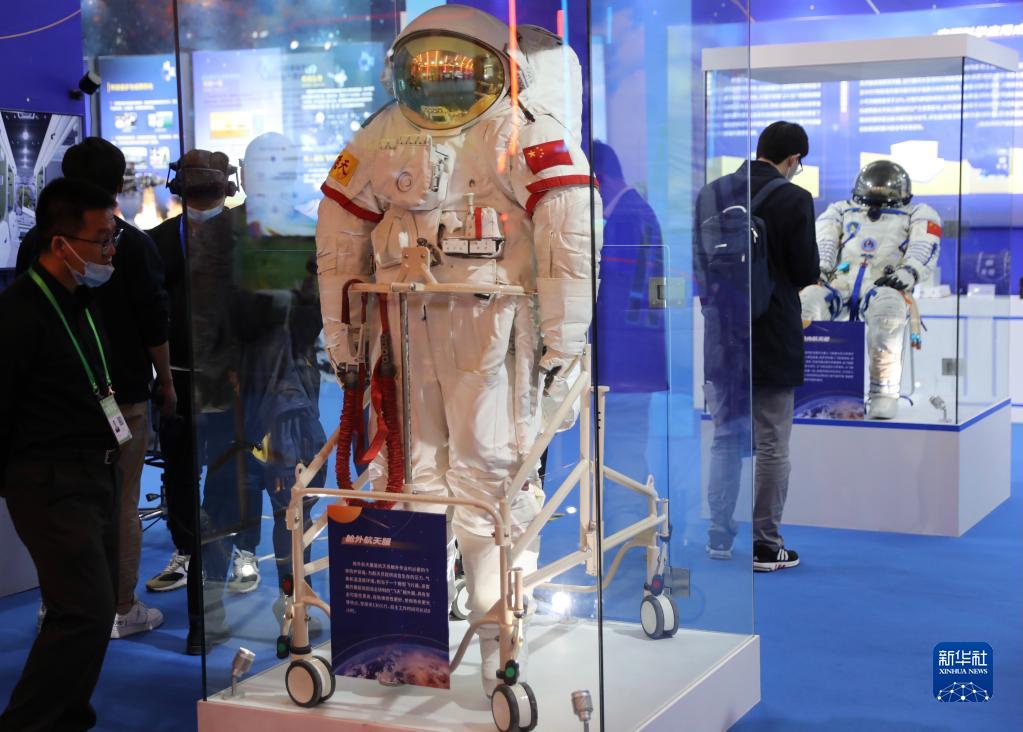10月21日,观众在北京展览馆参观国家“十三五”科技创新成就展展出的航天服。