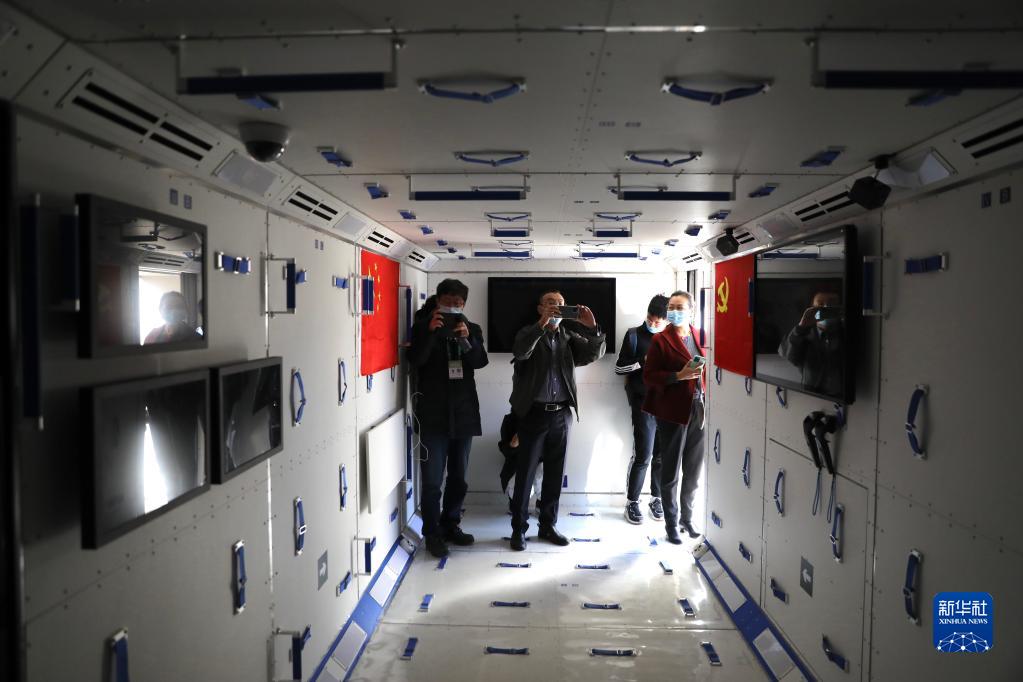 10月21日,观众在北京展览馆参观国家“十三五”科技创新成就展展出的天和核心舱大柱段模型内景。