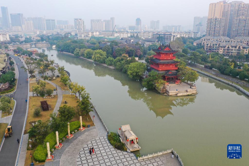 秋日清晨,旭日初升,市民在江苏淮安里运河文化长廊晨练,一派宁静祥和、充满活力的景象。