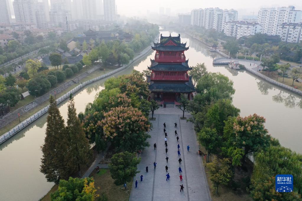 秋日清晨,旭日初升,市民在江苏淮安里运河文化长廊晨练,一派宁静祥和、充满活力的景象。