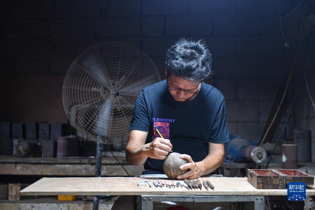 在位于海口琼山区儒传村的工作室里,柯秋枫用铅笔在椰壳上绘制即将雕刻的图案(9月14日摄)。