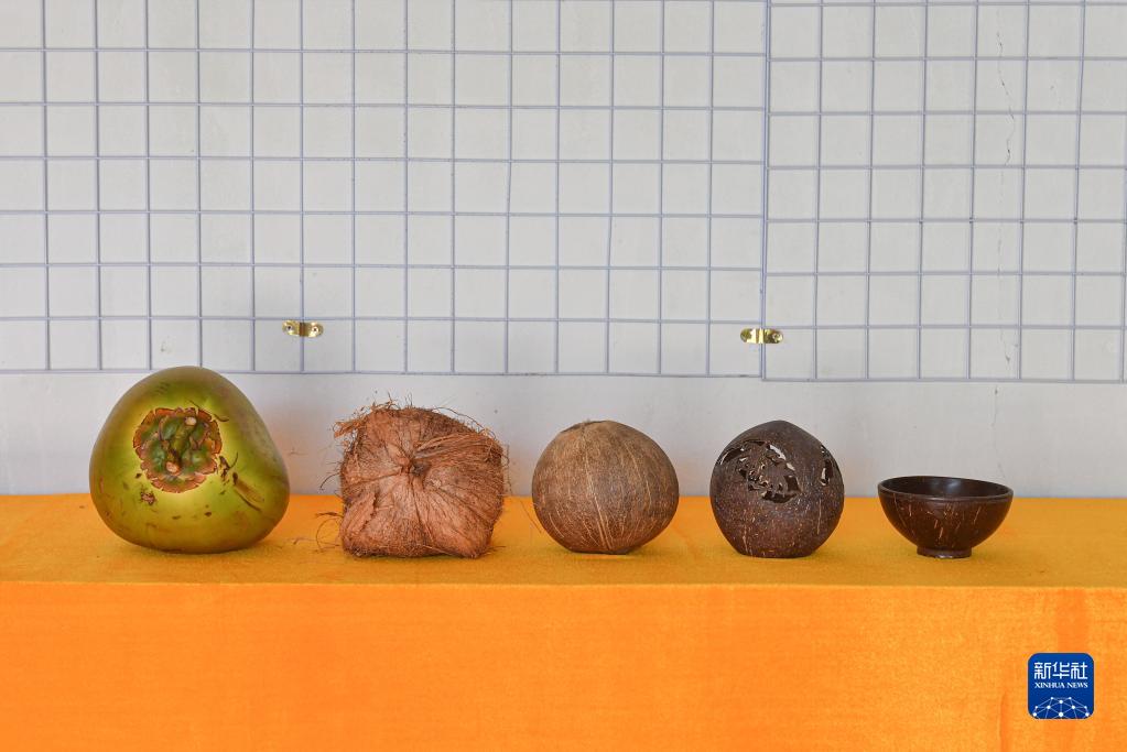 从左至右,分别是在柯秋枫位于海口琼山区儒传村的工作室里拍摄的椰子、椰壳(抛光前)、椰壳(抛光后)、椰雕香炉和椰雕碗(9月14日摄)。