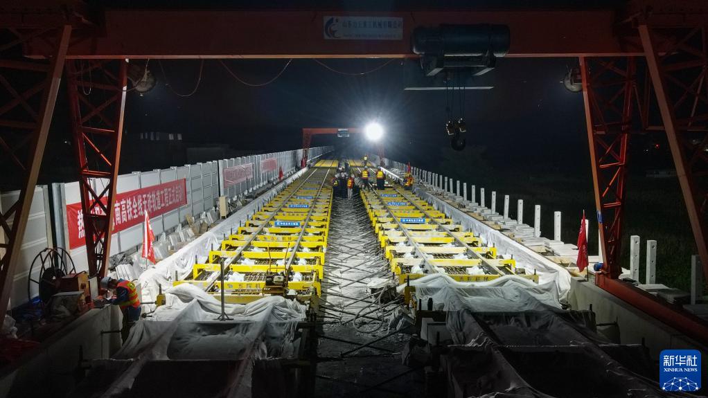 在贵南高铁广西段八仙双线特大桥施工现场,施工人员在铺设道床(10月27日摄,无人机照片)。新华社记者 张爱林 摄
