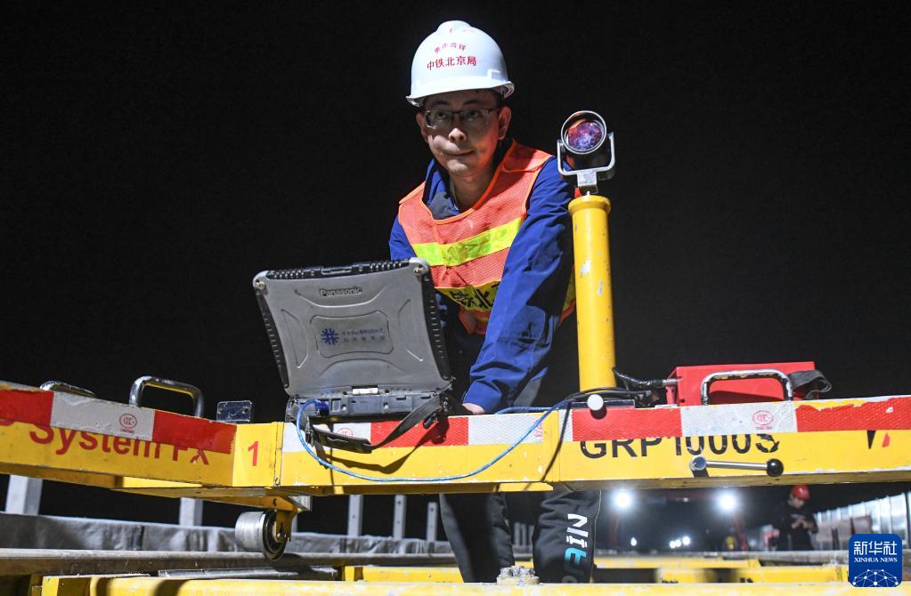 10月27日,在贵南高铁广西段八仙双线特大桥施工现场,一名施工人员对轨道精调数据进行复核。新华社记者 张爱林 摄