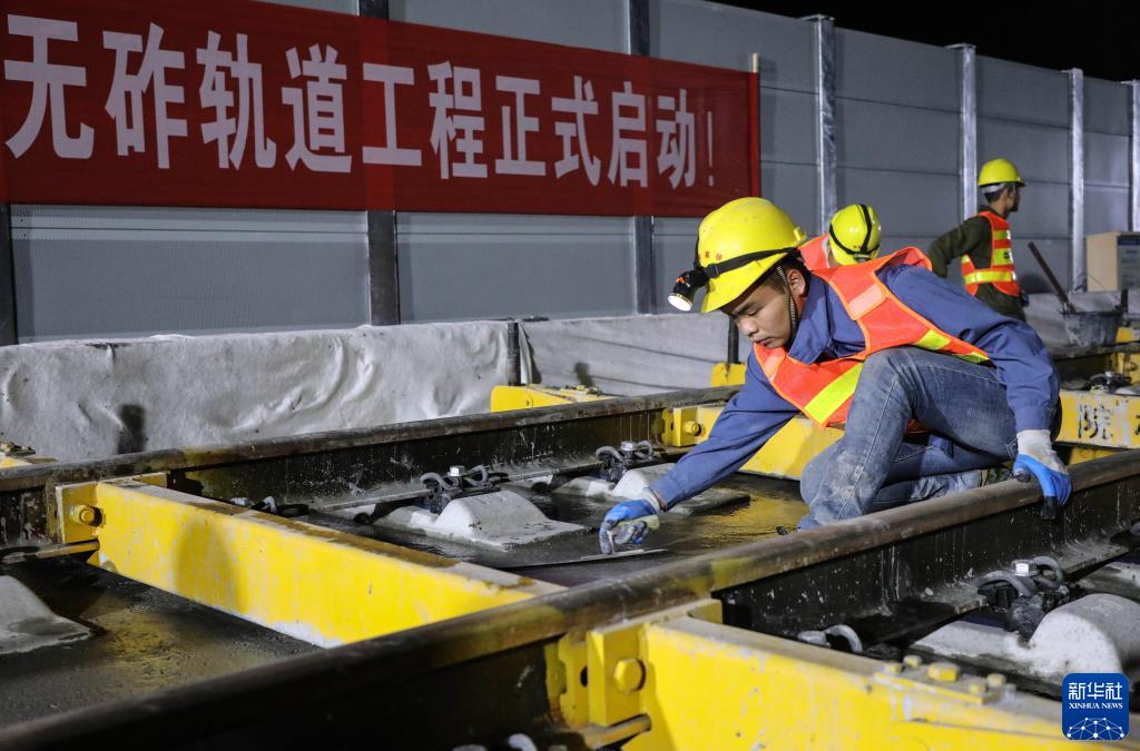 10月27日,在贵南高铁广西段八仙双线特大桥施工现场,施工人员对道床面进行平整。新华社记者 张爱林 摄