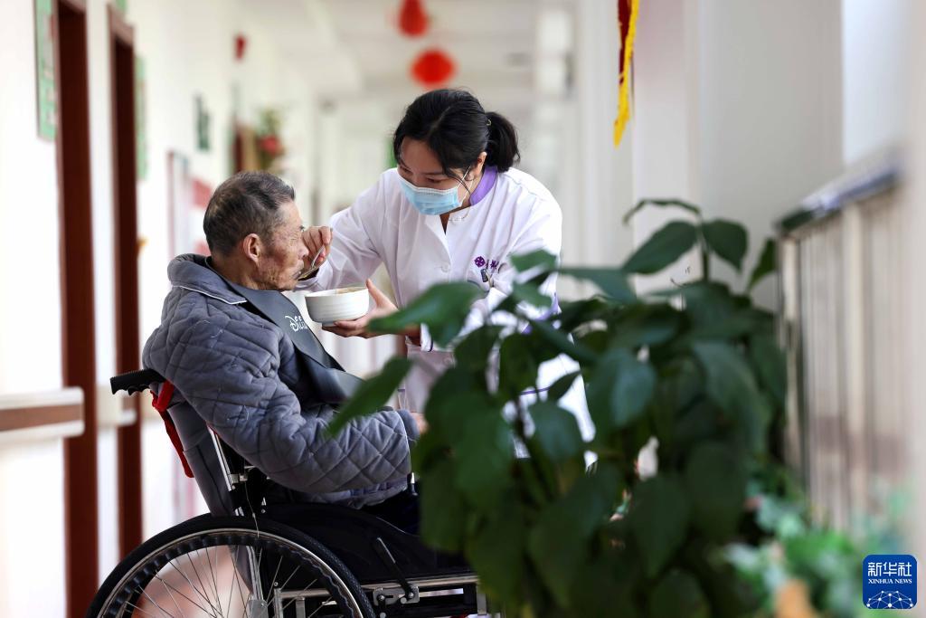 10月27日,在安徽省合肥市瑶海区东七社区居家养老服务中心,护理人员在给老人喂饭。新华社发(解琛 摄)