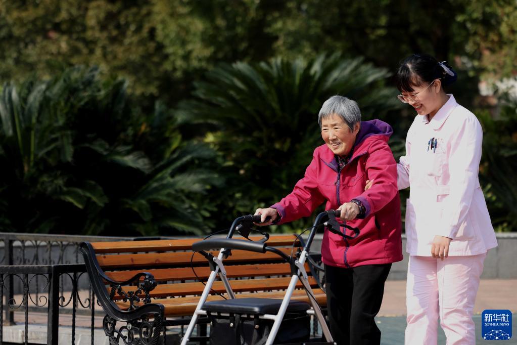 10月27日,在安徽省合肥市瑶海区静安养亲苑,护理人员在陪老人进行康复训练。新华社发(解琛 摄)