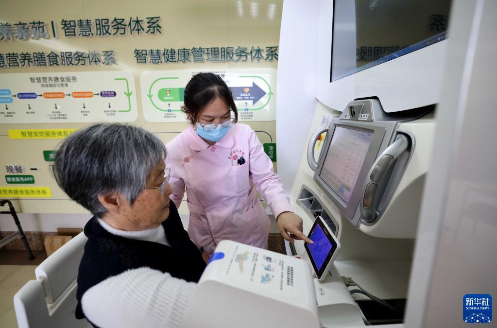 10月27日,在安徽省合肥市瑶海区静安养亲苑,护士在智能体检一体机上为老人进行身体健康检测。新华社发(解琛 摄)