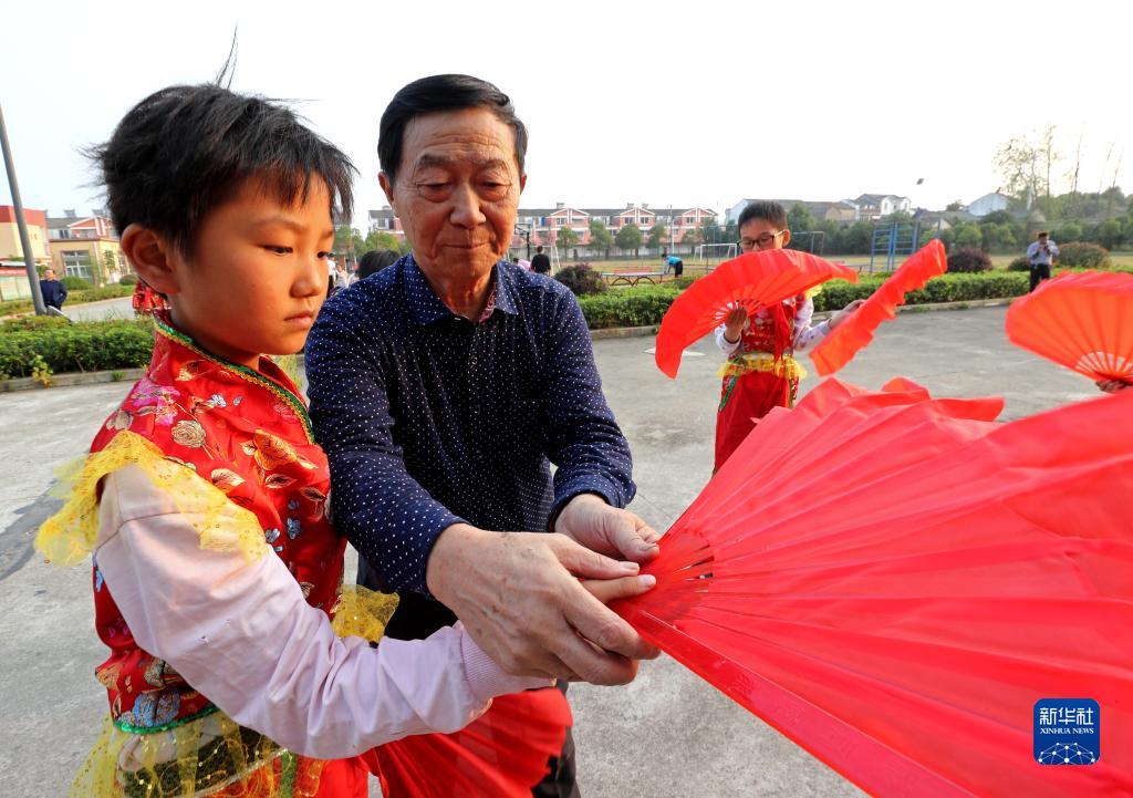10月27日,全椒县六镇镇明德小学学生在非遗传承人的指导下进行高跷节目排练。